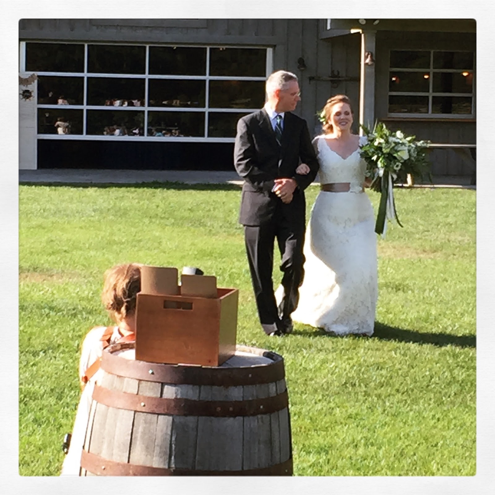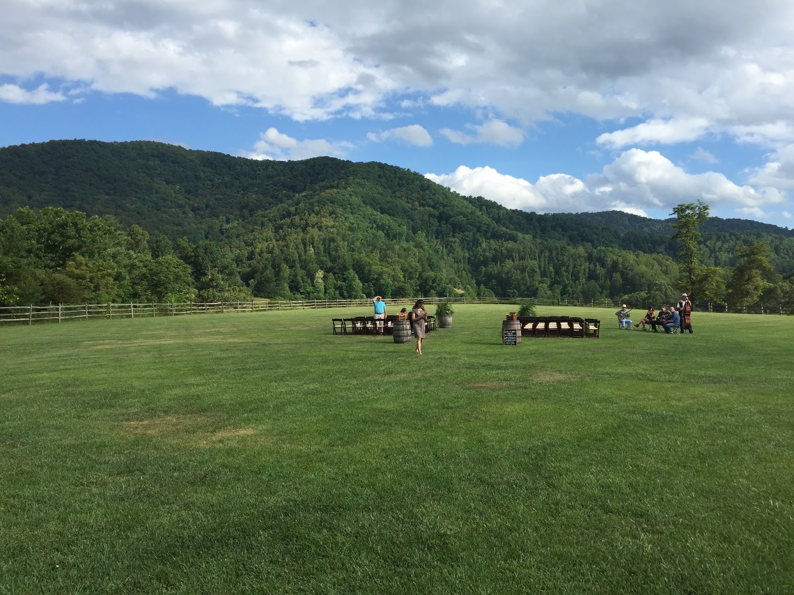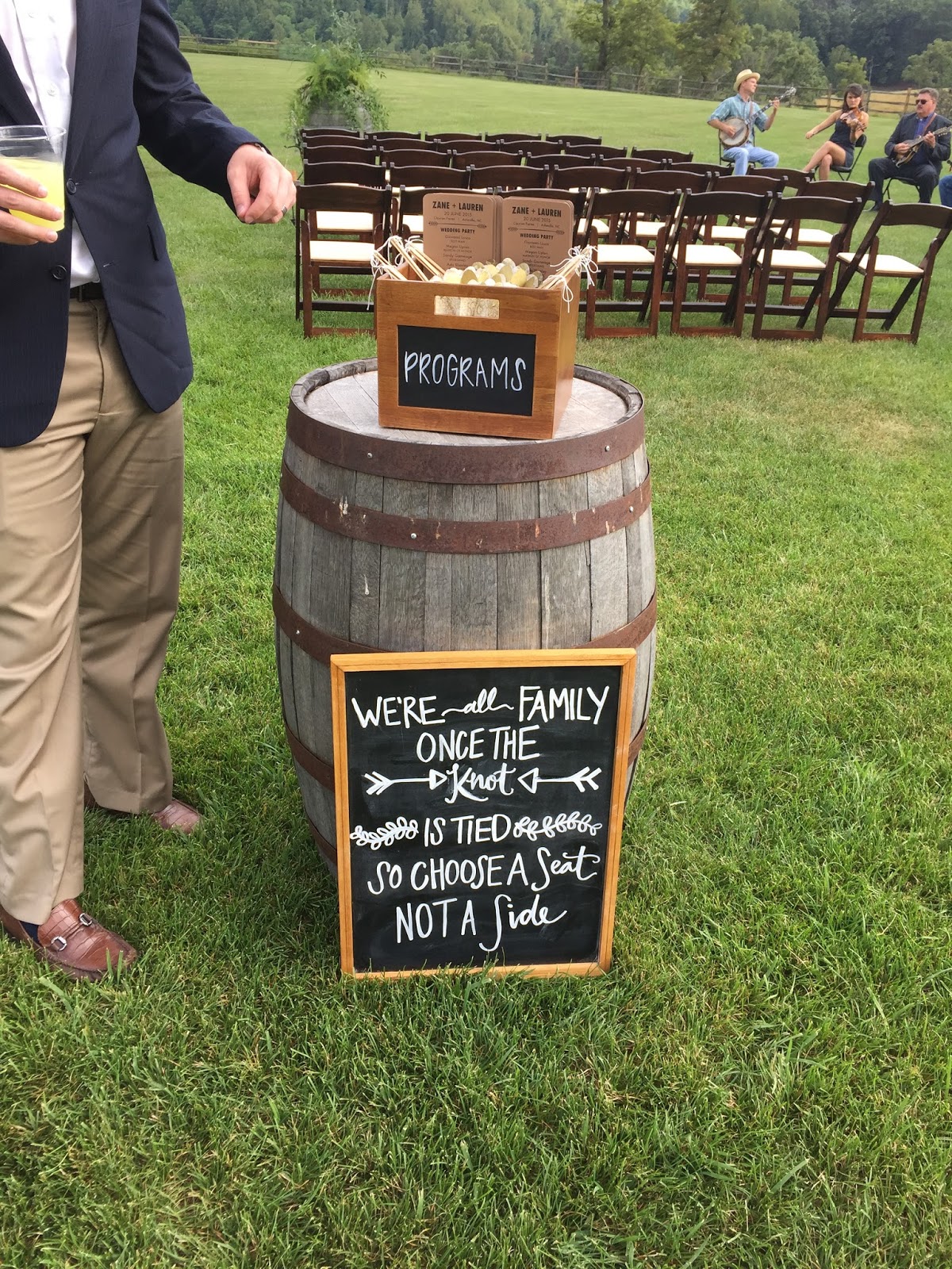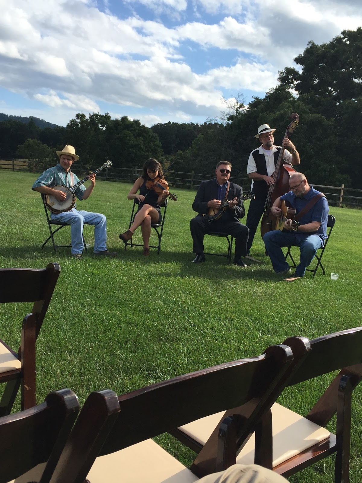Now on to the lovely wedding details. Kiwi and Peach (their nicknames) got married on top of a mountain in the Blue Ridge area. They had a shuttle that drove the guests up to the lovely wedding venue. I am going to show some photos of the details below. Their were so many lovely details all the way from the food and drinks (which was specific to the countries in which they have lived and visited) to the Bluegrass band that played both during the ceremony and then played and called group line dances during the reception.