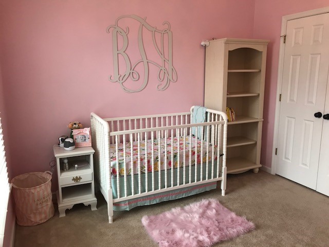 I am so excited to finally let you in today on a nursery tour of baby girl’s room. Hard to believe she will be here in just 16 days. Please note the room is about 90% finished. The only thing left is her curtains and curtain rods that my sweet mother-in-law is helping me with. I will be sure to post photos of the curtains once they are complete. Without further ado here is the rest of the nursery: