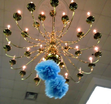 The decorations were also beautiful. The shower was held at their church and they hung pom-pom balls from the chandelier in the ceiling.