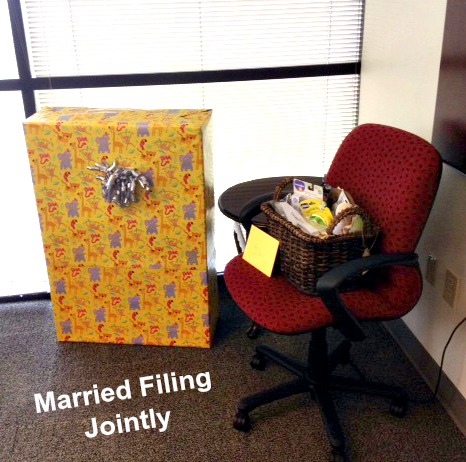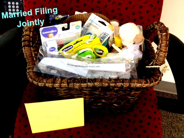And here is a picture of the gifts. We all went in and I purchased a high chair and a basket of goodies she had registered for. The picture of the high chair does not even begin to do it justice in how big it REALLY was. My sweet, poor husband wrapped the gift for me.