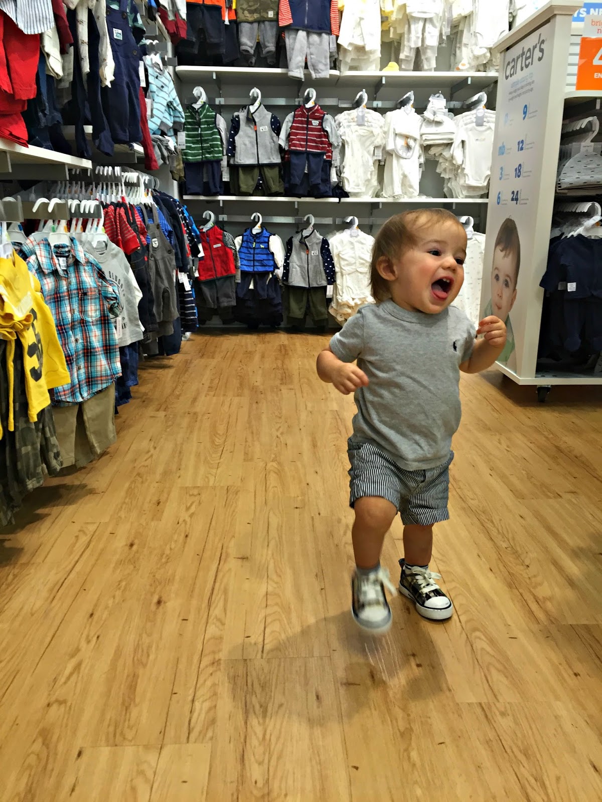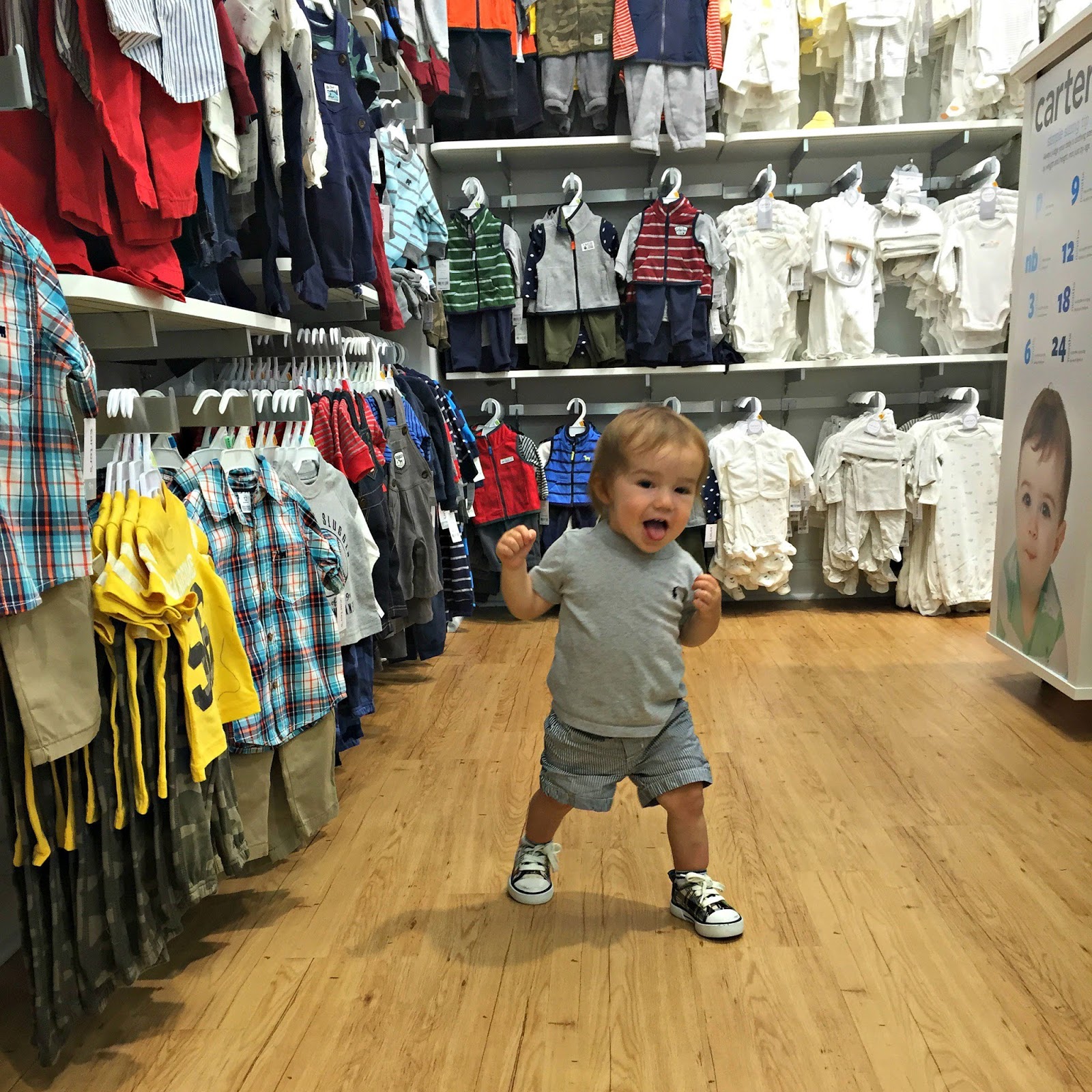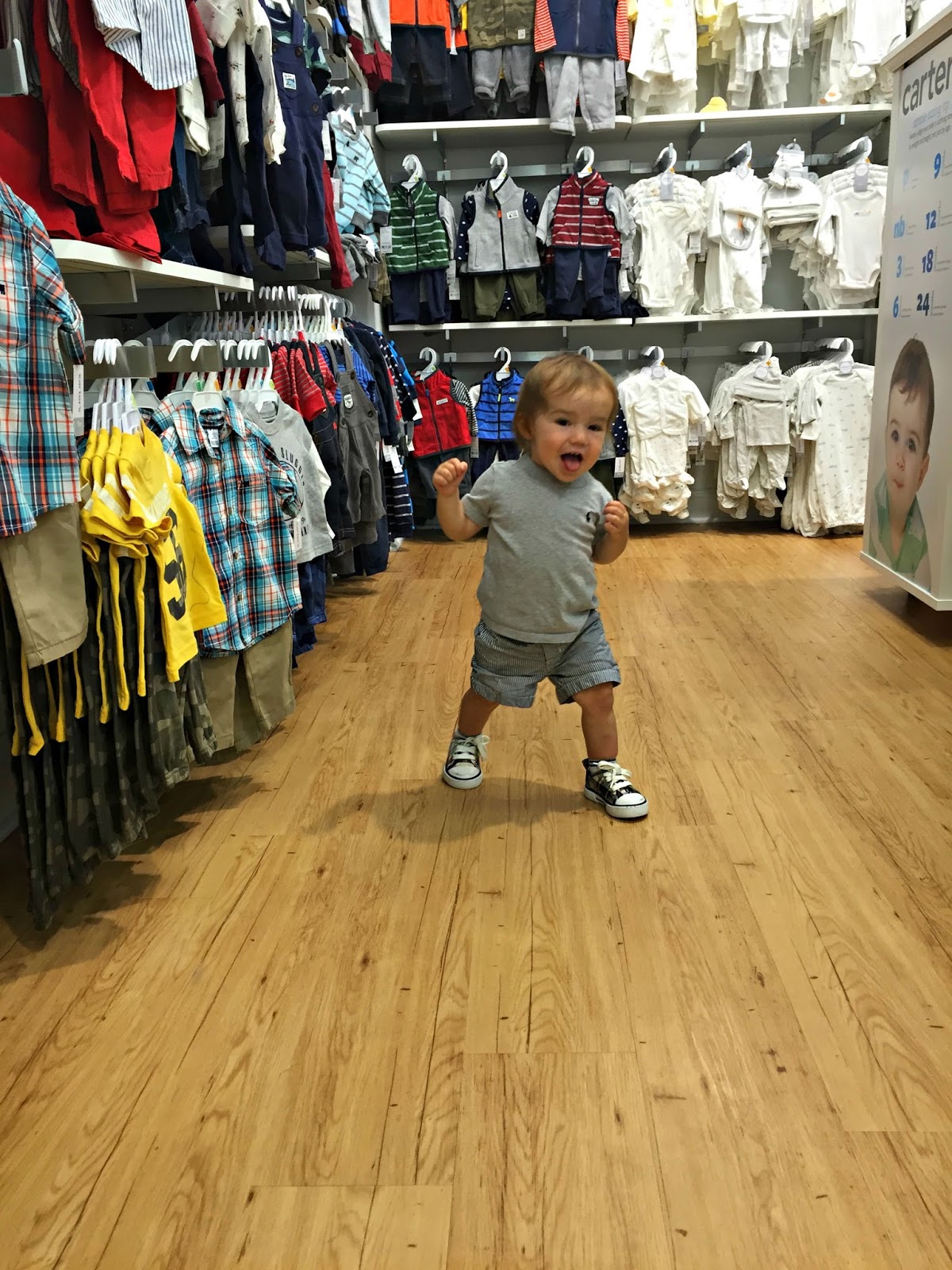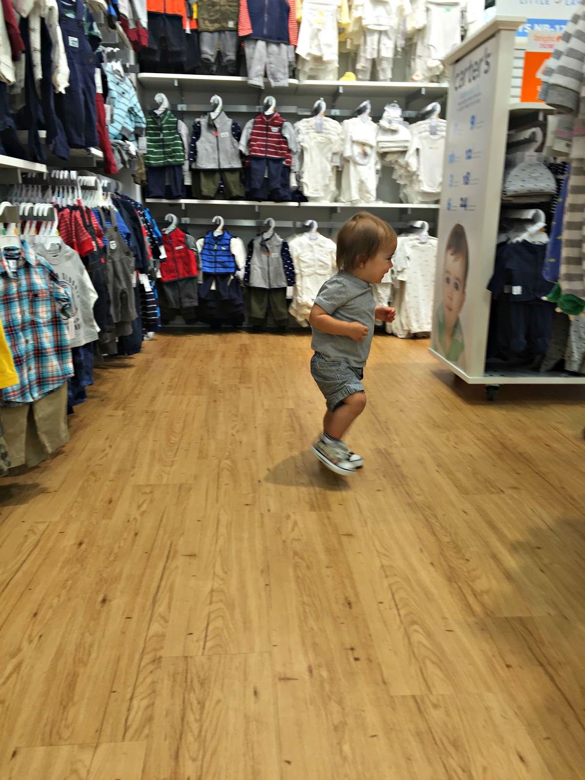 We are getting ready to transition in to the toddler room at my son’s school next week (another tissue please) and were in need of some new clothes for this summer heat we are having and also clothes to get us in to fall. So this past weekend we made a fun Saturday morning out of it as a family and hit up one of my favorite places for cute, functional, affordable clothes that are durable; Carter’s.