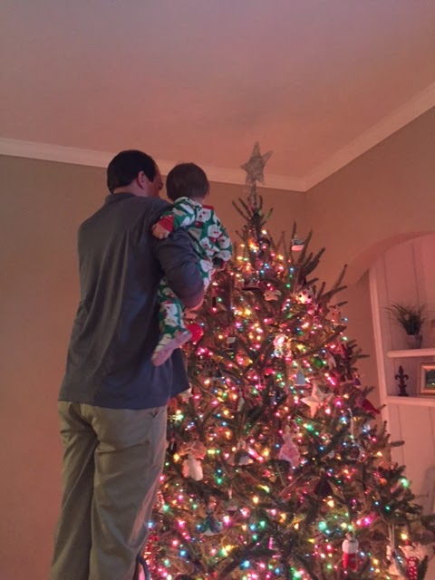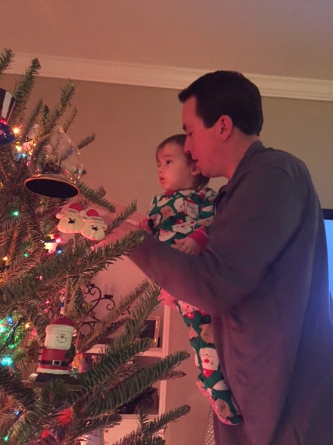 After dinner it was time to decorate the tree. Little “e” was way into it with some help from Dad.