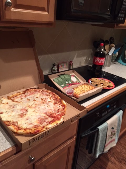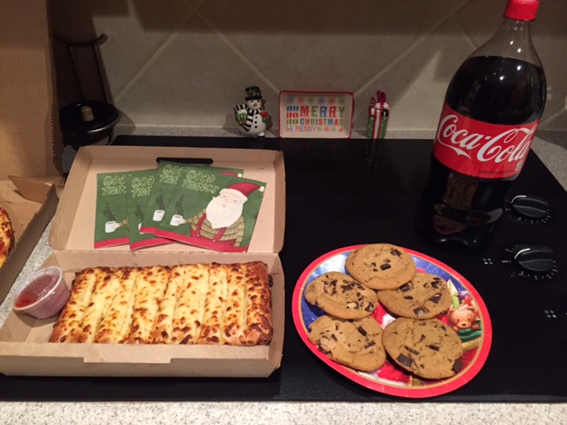 One of our family Christmas traditions is having a family Christmas party and decorating the Christmas tree. We had a fun family Christmas night (that a occurred on a weeknight) decorating our tree together as a family and watching “The Grinch” this past week. Thanks to Sam’s Club I swung by and picked up the Coca Cola Family Pizza Combo on the way home from work (complete with a hot 16 inch pizza, cheesy bread sticks, cookies, and a 2 liter of Coke) for just $13.98! I then came home threw out some paper plates and napkins, turned on some Christmas music, and we began our own little family Christmas party with a Christmas themed meal.
