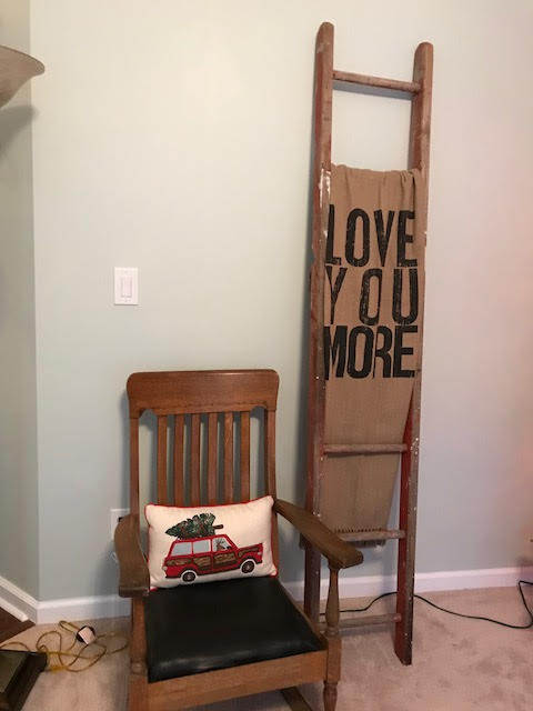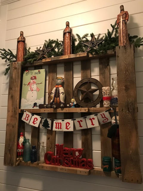 The pallet wall is a mixture of homemade Christmas decor made by our little guy, sleigh bells, and of course our wooden wise men