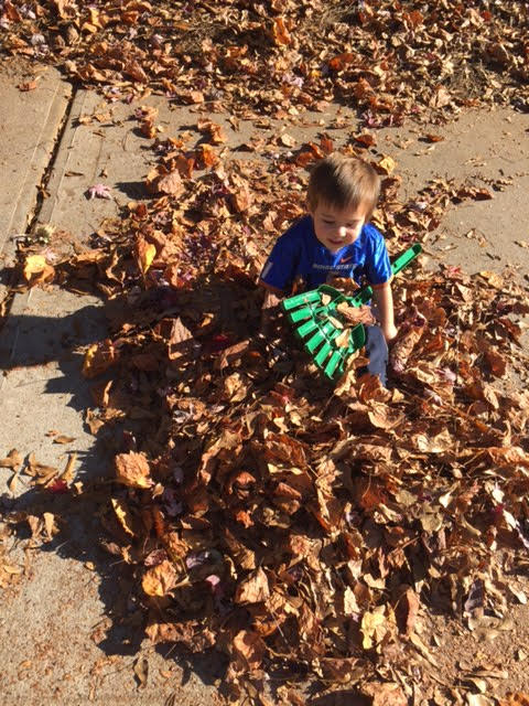 * E, our two year old, has discovered raking and jumping in leaves and it is his new past time. This kid cracks me up.