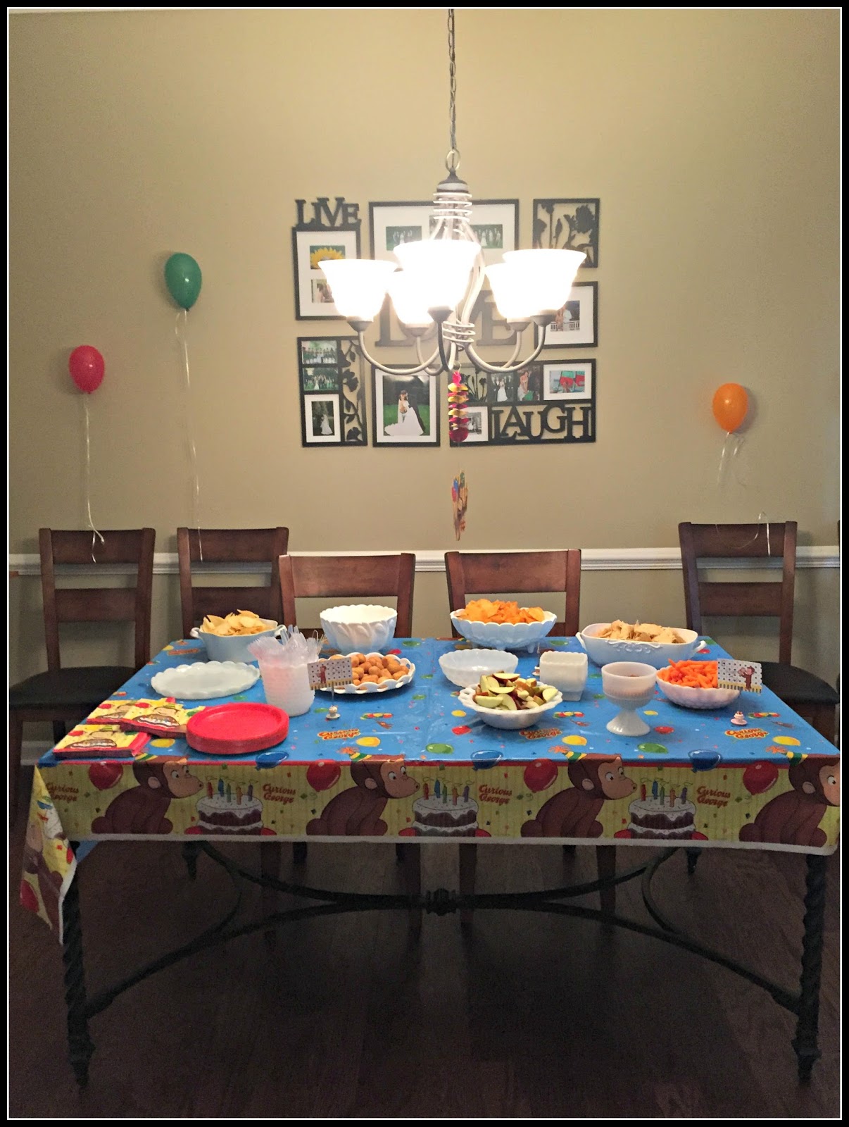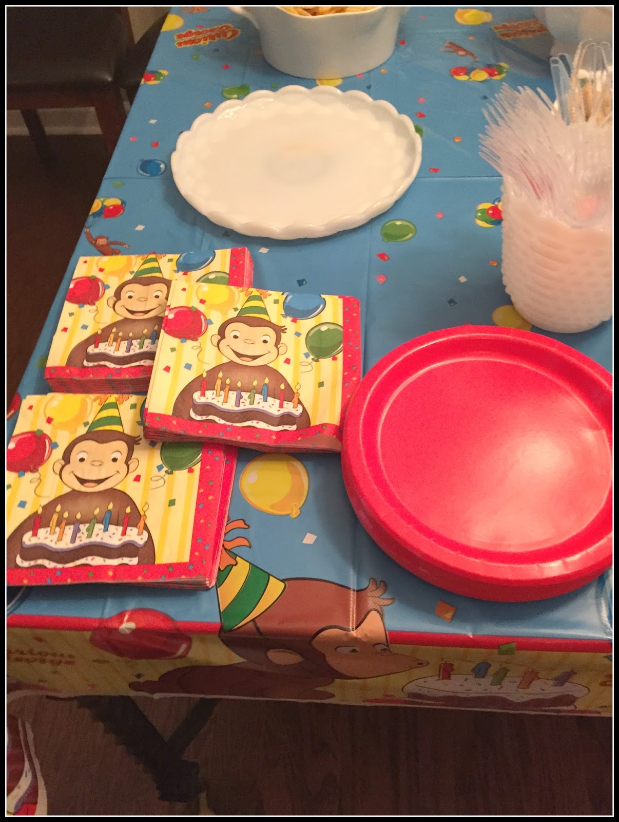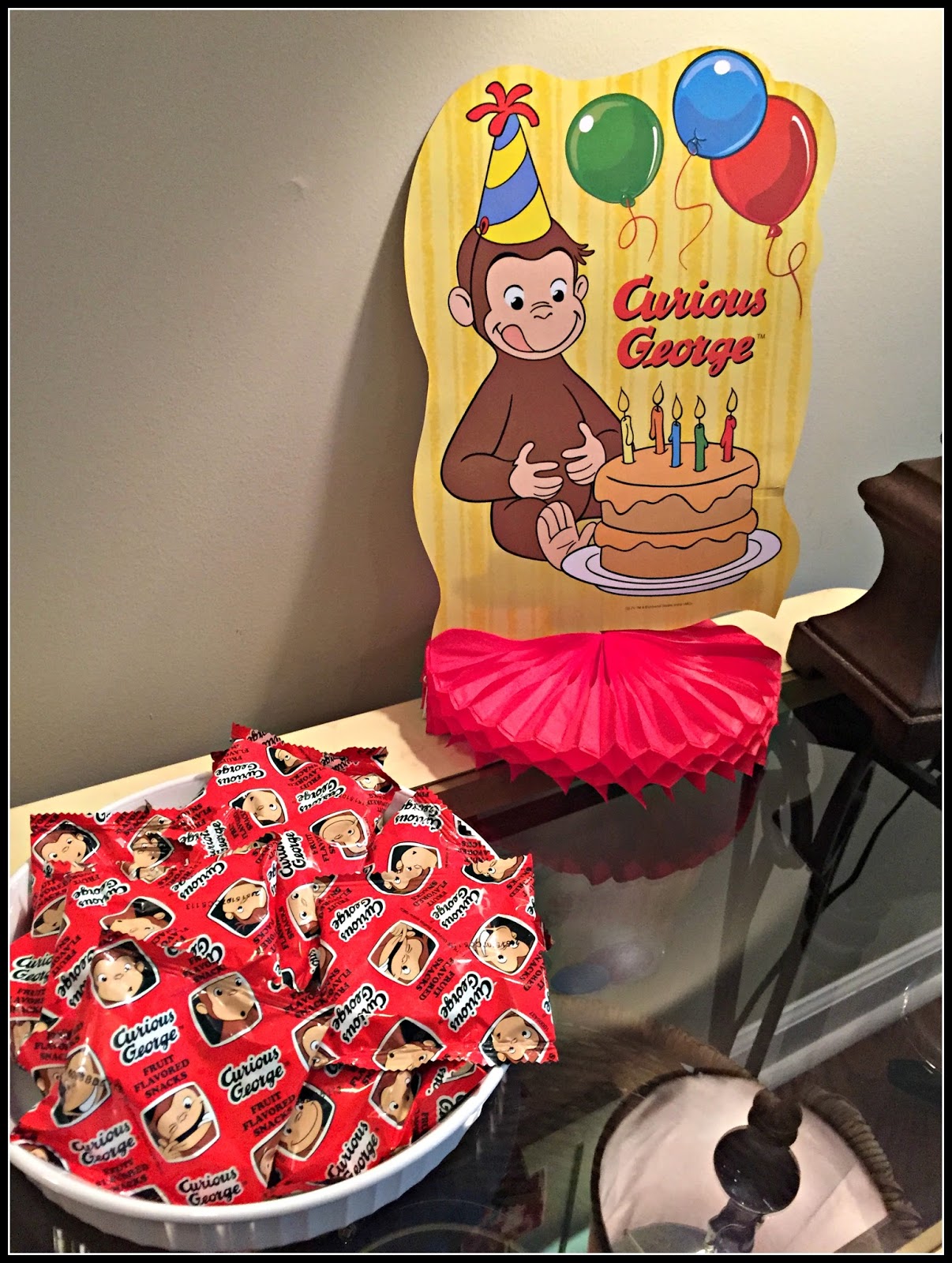 Since he is one and let’s face it…all he will remember of his party is the pictures and what we tell him about it I purchased a Curious George birthday book and set up a station to have all the guests sign his book so he can remember who is there. I also had Curious George fruit snacks set out for all the guests to take as favors.
