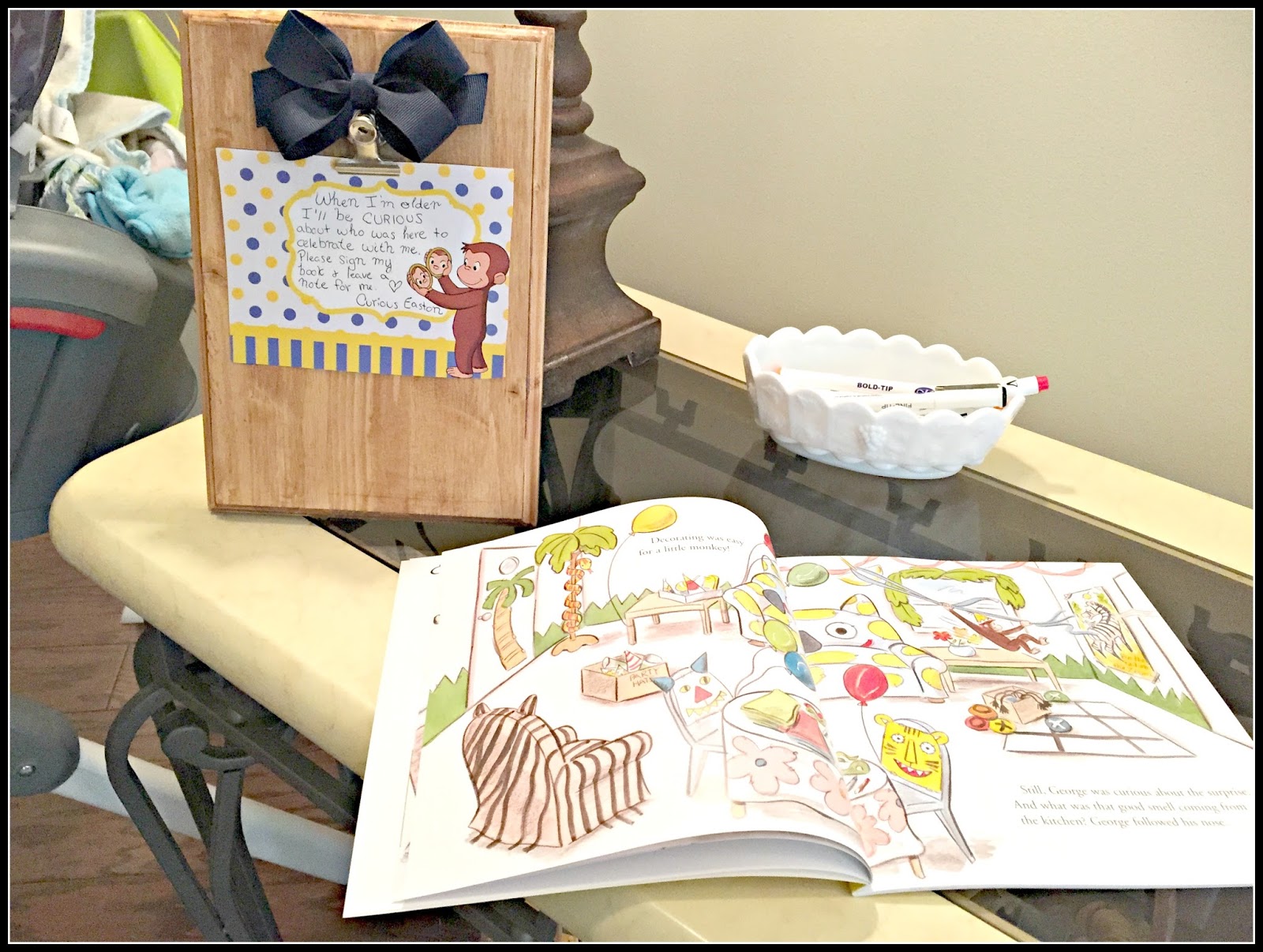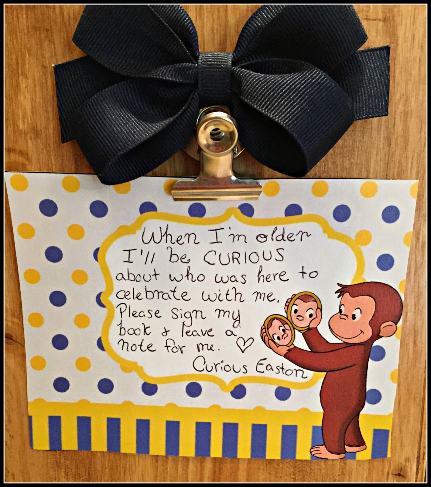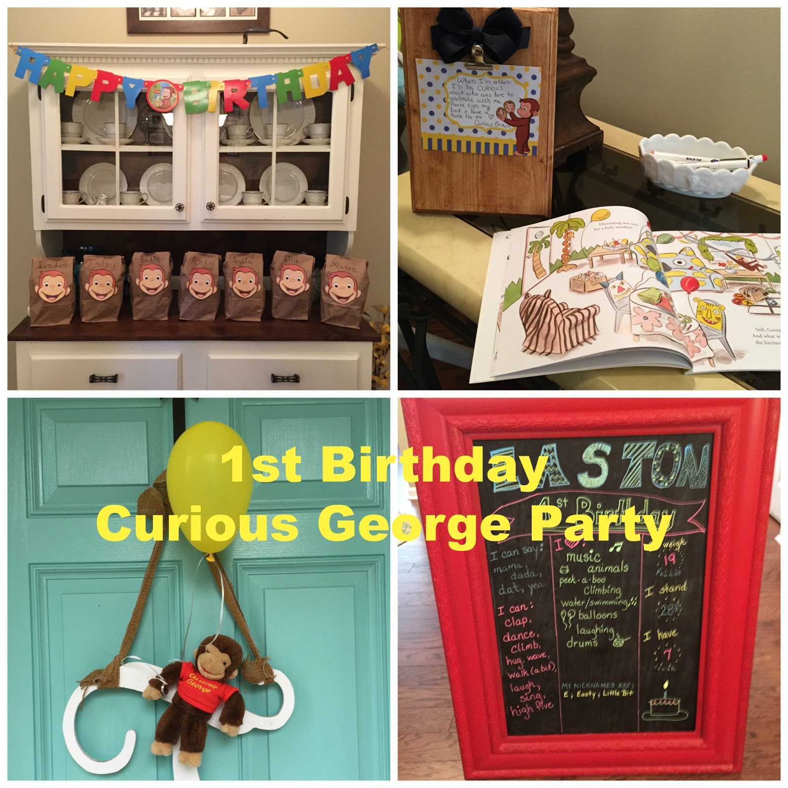 Since he is one and let’s face it…all he will remember of his party is the pictures and what we tell him about it I purchased a Curious George birthday book and set up a station to have all the guests sign his book so he can remember who is there. I also had Curious George fruit snacks set out for all the guests to take as favors.