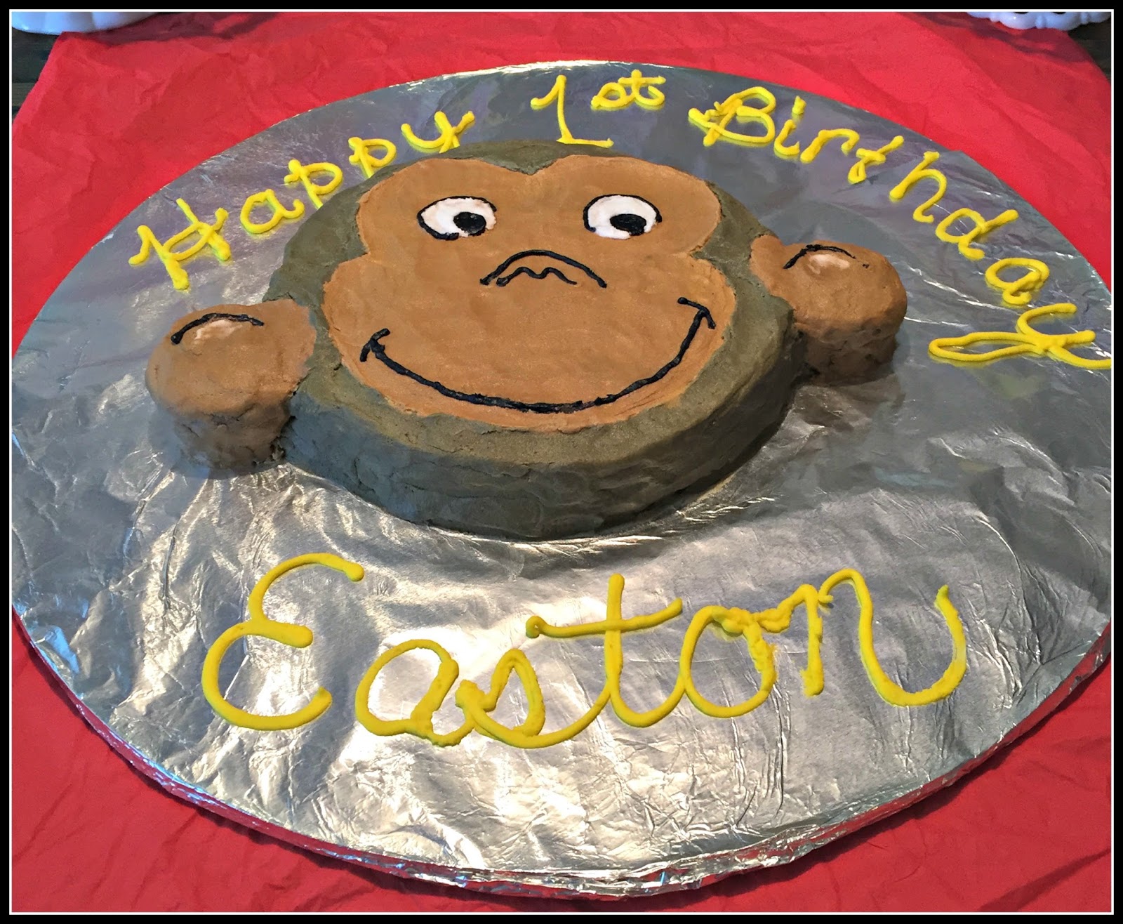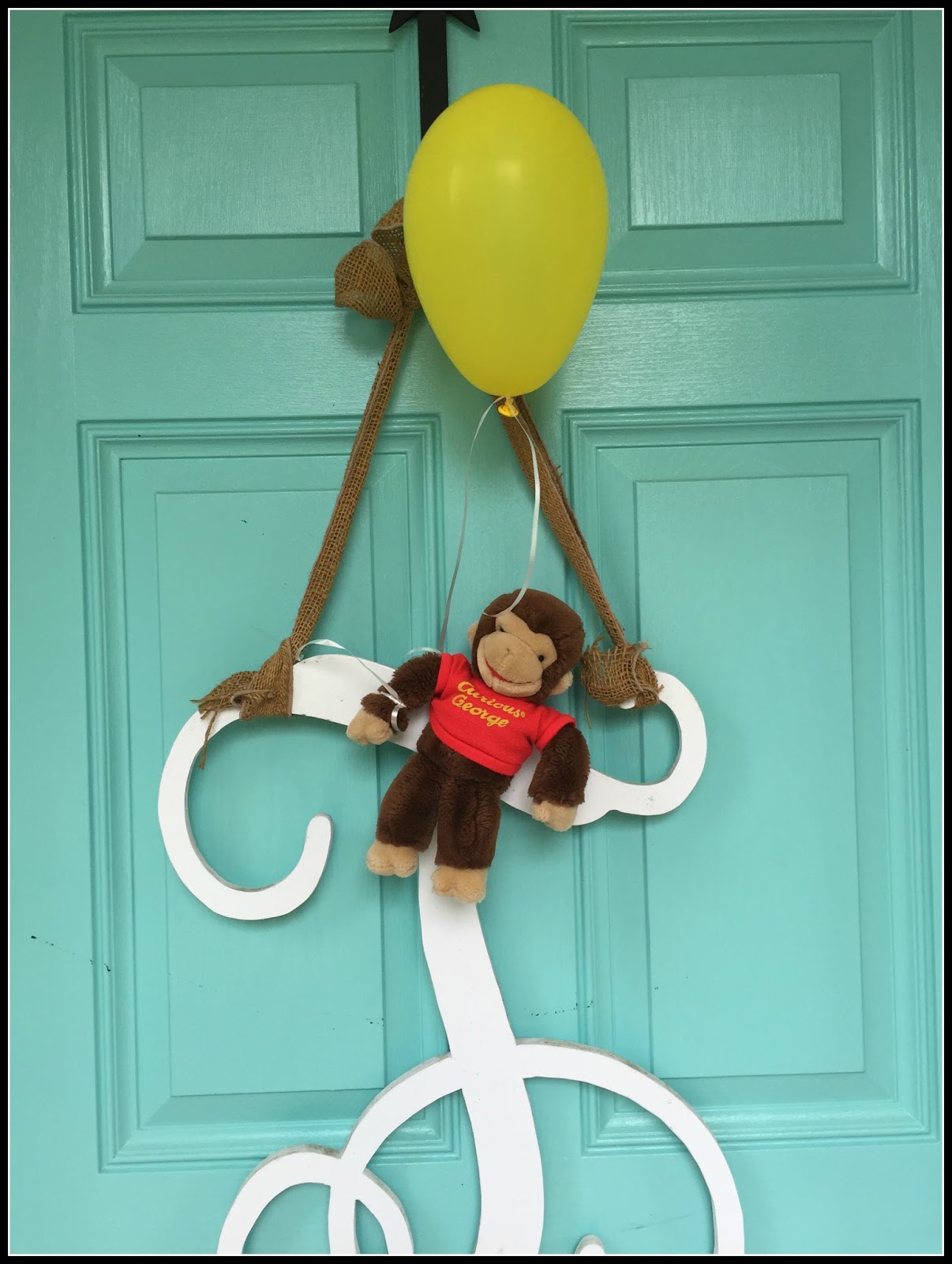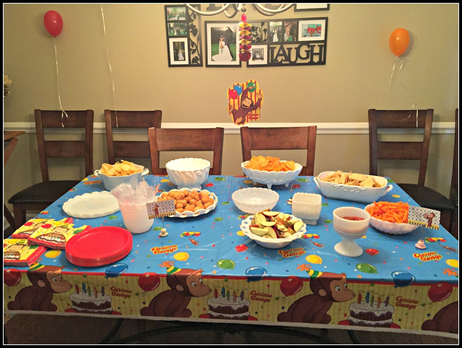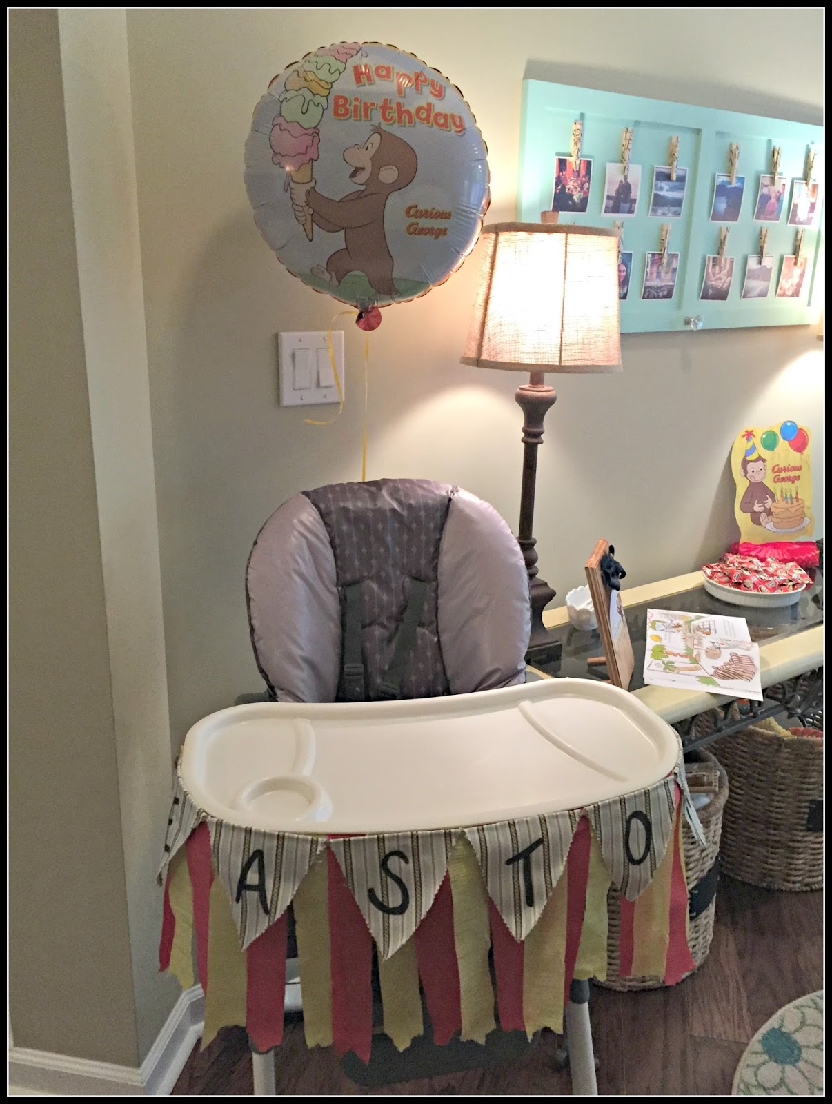 I decorated the highchair with red and yellow streamers and a banner I made with this name on it. I then tied a Curious George balloon to the top of the highchair.
