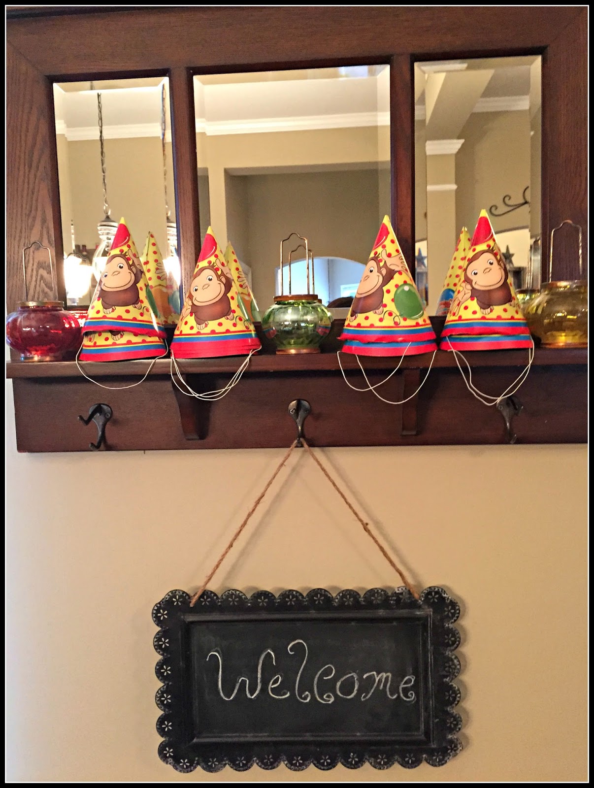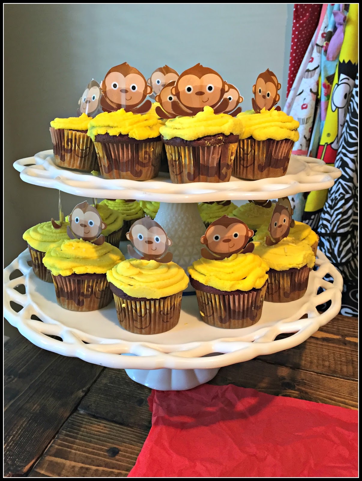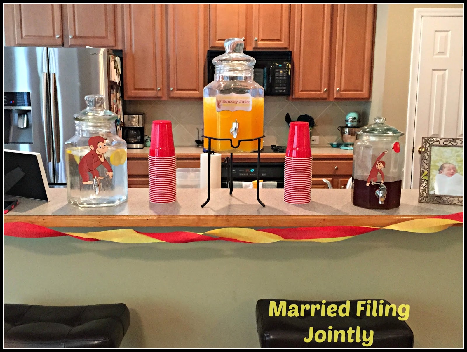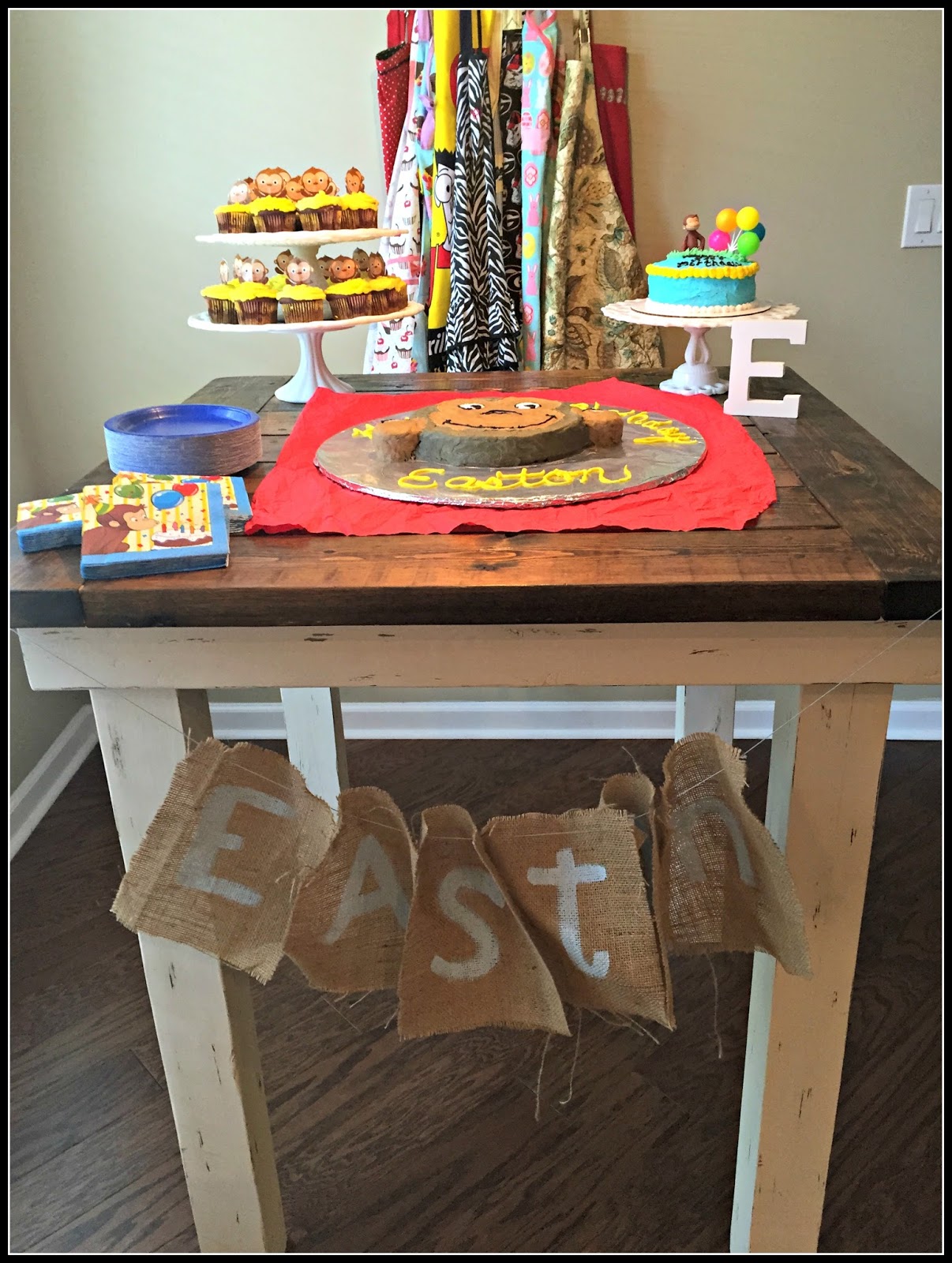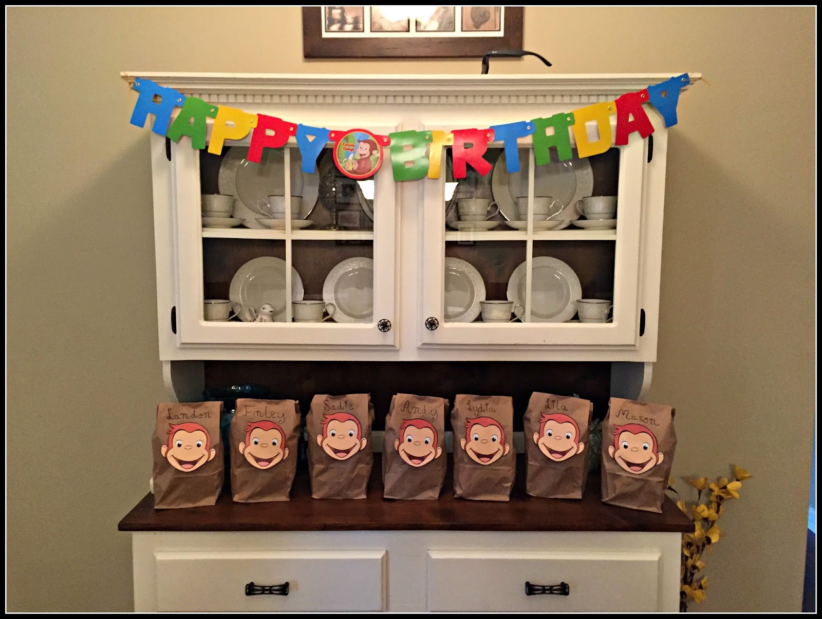 I decorated the highchair with red and yellow streamers and a banner I made with this name on it. I then tied a Curious George balloon to the top of the highchair.