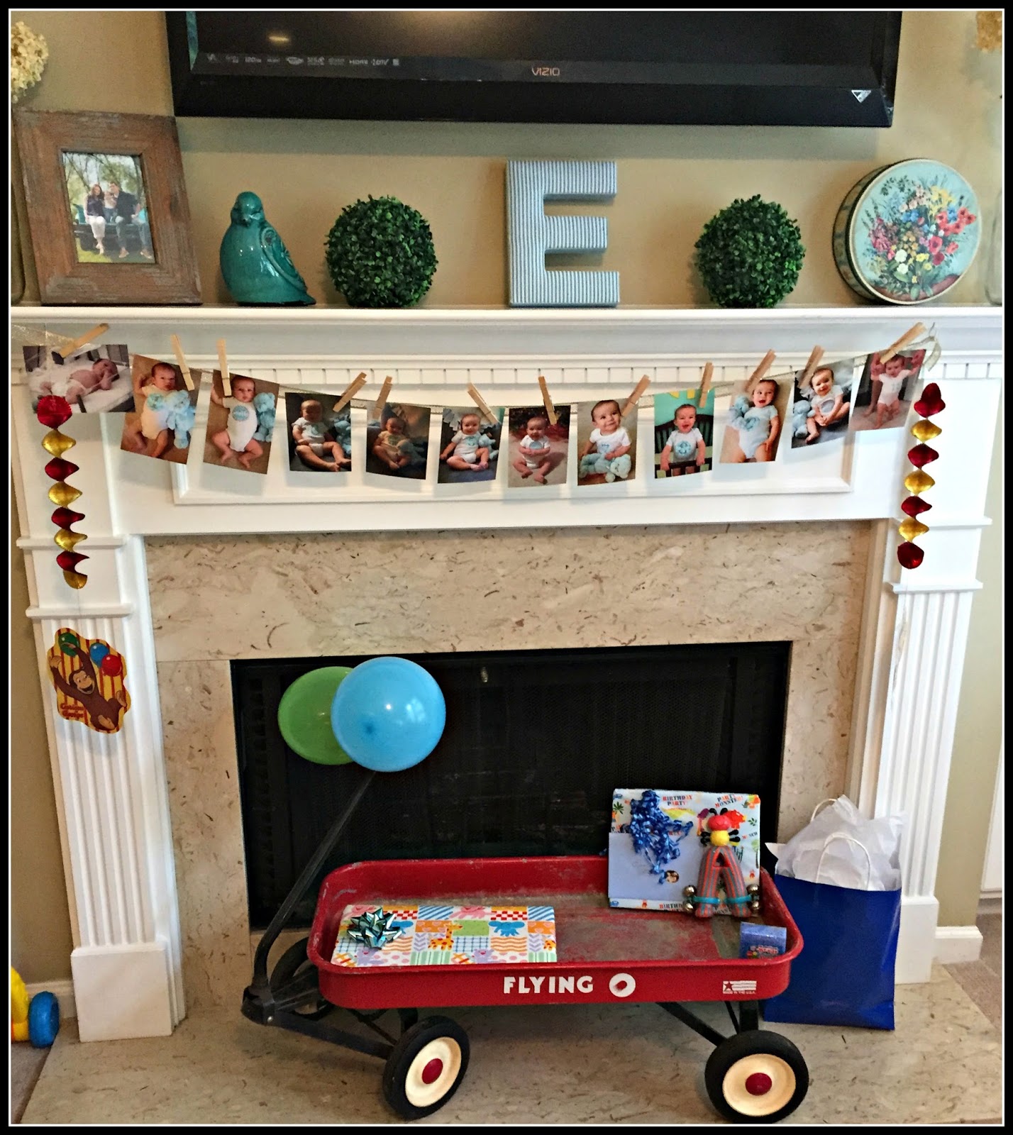 I decorated the mantle with photos I had taken from birth-12 months (one a month) and used a letter E to frame the center of the mantle. I used a wagon to hold all the gifts.