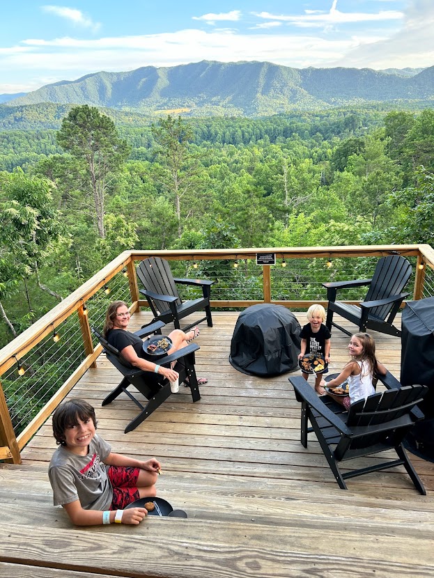 back porch of glamping tent overlooking smoky mountains