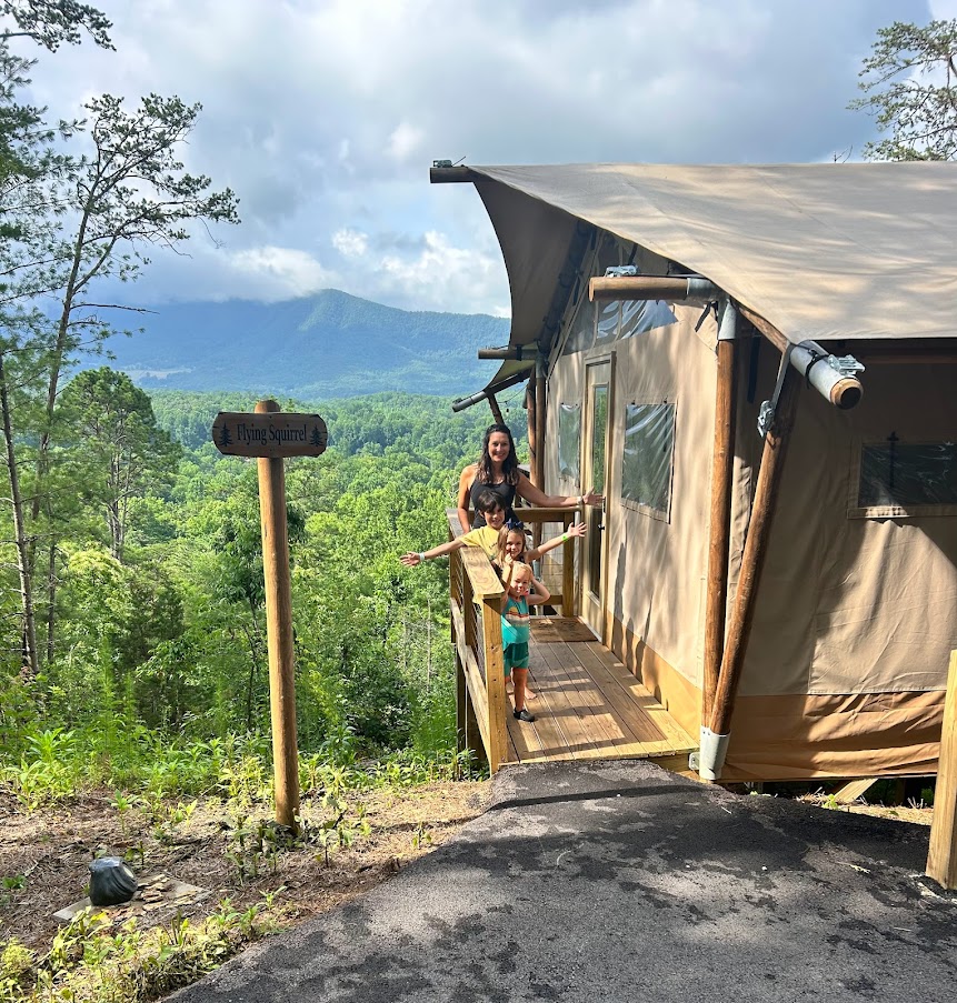 family in front of glamping tent with smoky mountains in the background