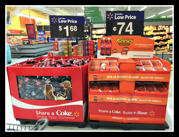 We stopped by WALMART to run an errand and their new cute Coke/REESE’S cup display caught our eye. You are all probably familiar by now with Coca Cola’s “share with a friend” campaign in which you can find Coca Cola 20 oz. peronalized name bottles to share with those in your life. You might not yet be aware that now REESE’S Peanut Butter Cups also have fun words to describe special people in your life such as Epic”, “Fab!”, “My Fav”, etc available exclusively at WALMART. This year’s Coke campgain is bigger than ever with over 1000 names printed on bottles and WALMART has the widest selection of names on displays that make it fun and easy to find a name of someone you would like to celebrate. I thought that these two products would make a fun combination to surprise my hubby with just to let him know how much we appreciate him.