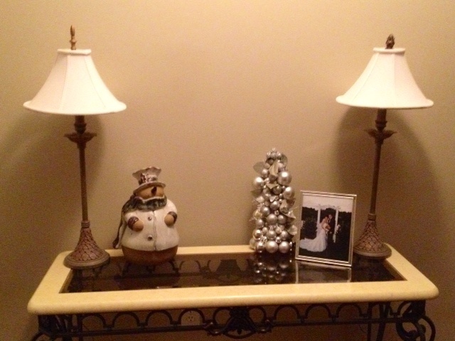 Entry Wall Table with Snowman and Silver Ball Christmas Tree