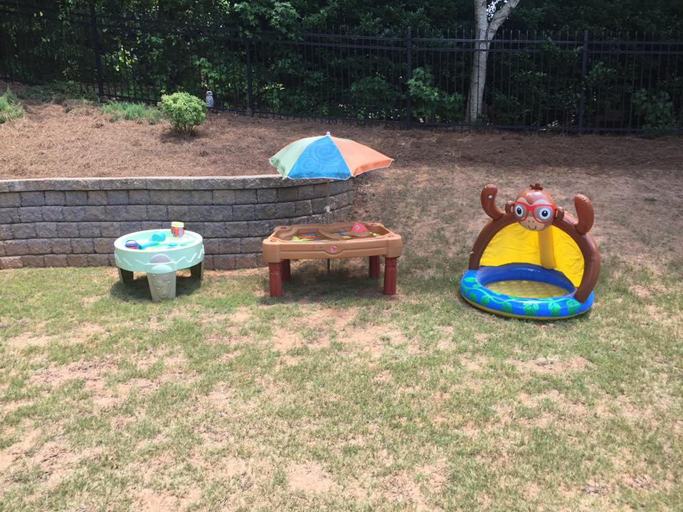 Since we knew it would be a hot one (not 104 mind you but yes still hot) we setup water stations around for the kids to plan in and asked them to wear bathing suits. So water stations were next. Another hit to the party was batting a water balloon off the tee. The kids LOVED it!