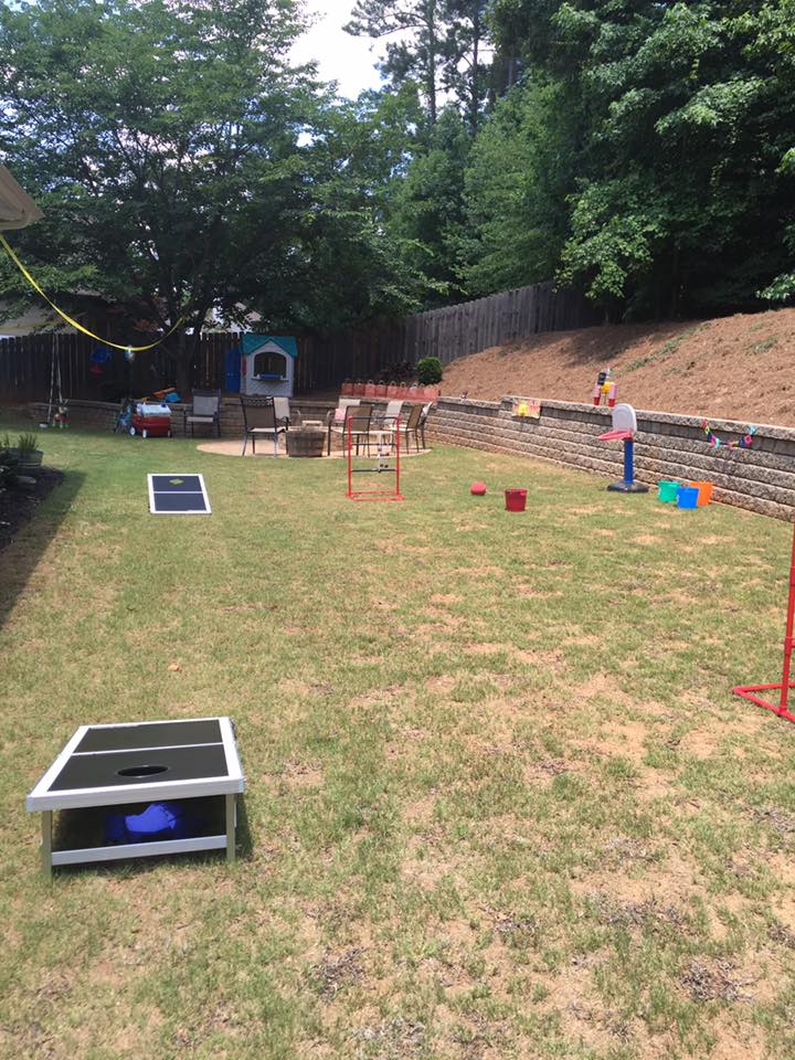 The only negative to the party was it was outside. We had about 50 people and my house does not fit 50 people comfortably. Little did I know it would be the hottest day of the year. Seriously, heat index of 104…we have some amazing friends and family for sticking it out. Unfortunately we forgot to take a single photo of mommy and daddy with the birthday boy but I did manage to take some photos the party before the guests arrived. This sign greeted guests as they walked up.