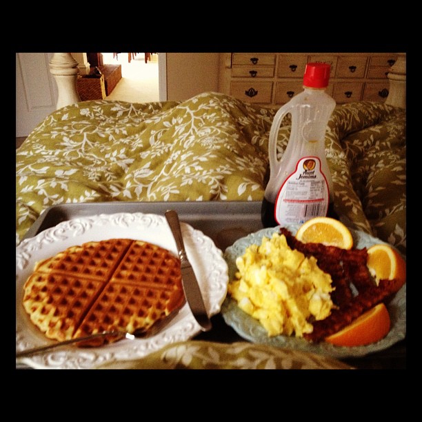 The next morning (the much anticipated surprise mystery birthday date day) he awoke me with an amazing breakfast in bed. Be jealous (and ignore our make shift bed tray and my leg under the comforter).