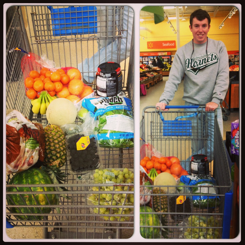 $58.34 later (man, eating healthy is expensive…and that was just three days) we had our cart loaded with a carton of Whey protein, a bunch of fruits, three avocados, and three potatoes.