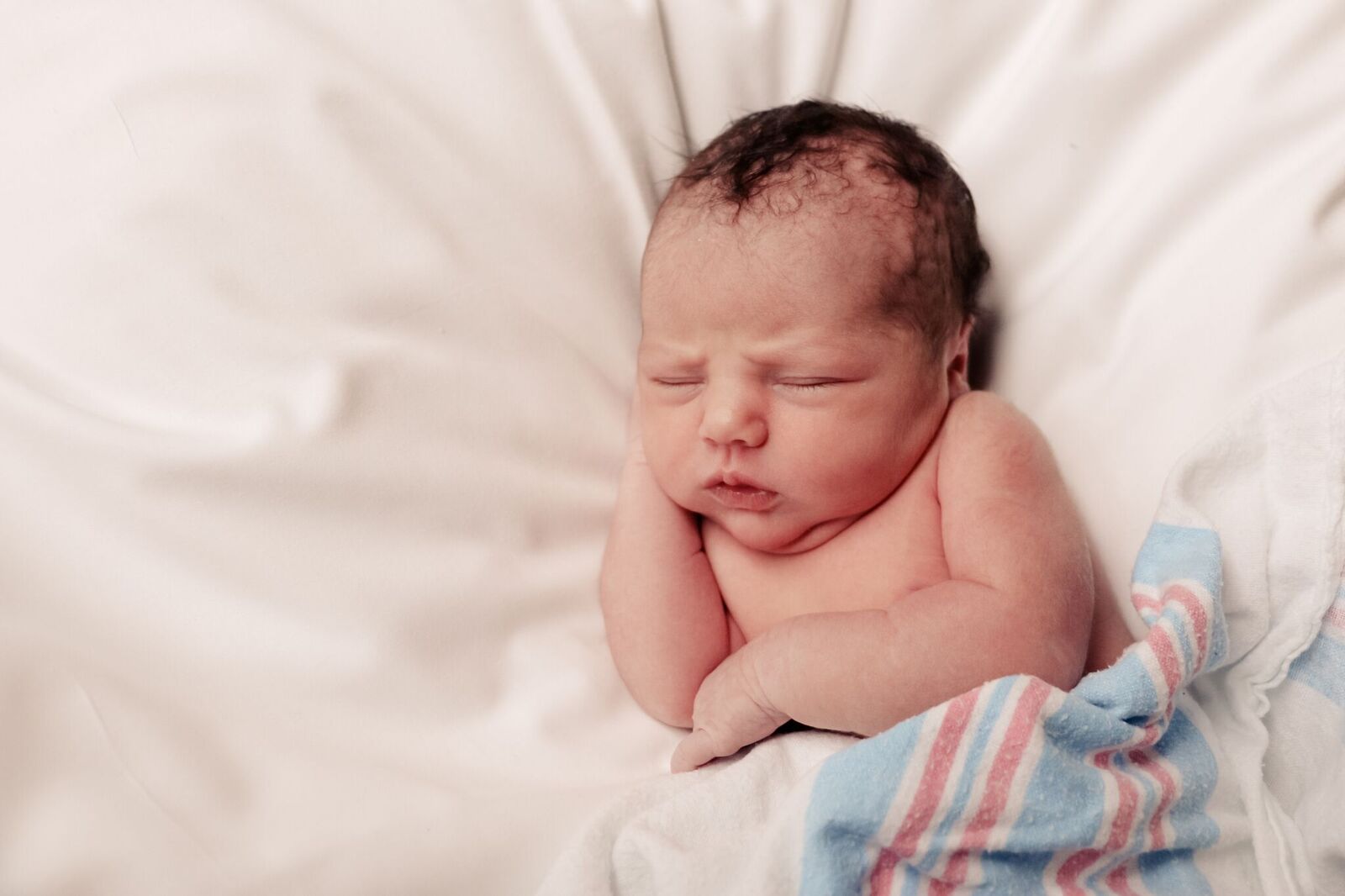 At 7pm they rolled me back to begin surgery. They inputted both an epidural and spinal, prepped me, and began operating. I was throwing up a LOT which let me tell you, it is not fun to throw up when your stomach is cut open…45 minutes after they had taken me back they FINALLY brought my husband into the room. When he walked in he said it was hard not to cry. They had originally told him they would get him 15 minutes after they took me back so when that 15 turned to 45 (turns out my blood pressure was so high that they were trying to get me stable before bringing him back) you can imagine he was a nervous wreck having no idea what was going on…he walked in to find my arms strapped down to tables, lying cut wide open in a freezing cold operating room…it was pretty intense to say the least. VERY shortly after my husband arrived in the room they said ok Dad get your camera ready and told him to lean over my blue screen to take a photo. He did and quickly responded, “no thanks.” It was apparently that intense even for a man who doesn’t usually get grossed out by that kind of stuff. My hubby did bring in our Bluetooth speaker and started playing music for me which was a huge help mentally.