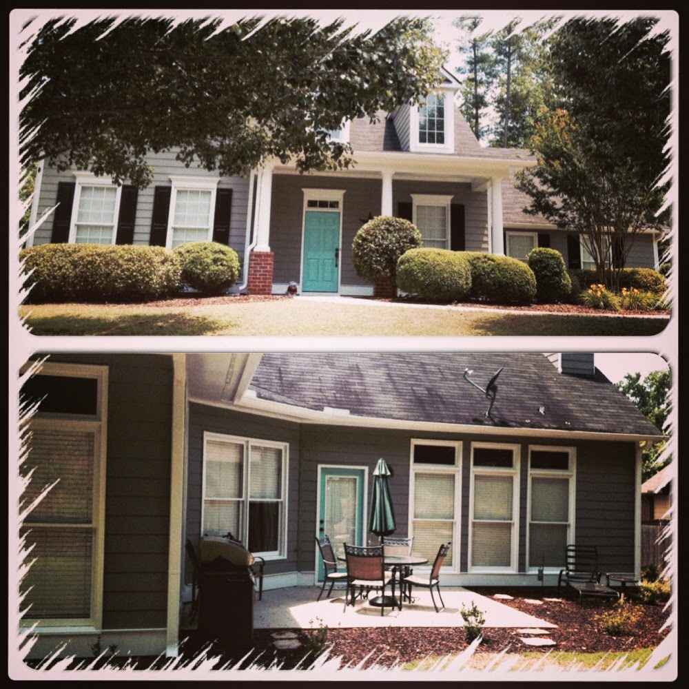Big difference, right? From a nasty, mildewy, whiteish color with green shutters and a ugly green door to the above! Picking the paint colors was the easy part for me. We searched homes online and used Pinterest to look for colors. After narrowing it down to a few options we went to Sherwin Williams to get a little paint sample and the hubby painted a test area on one wall so we could make sure we liked it. We ended up with SW7018 Dovetail, SW6991 Black Magic for the shutters, and my personal fav, SW0075 Holiday Turquoise for the front and back doors. Here is a better photo of the doors: