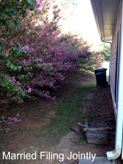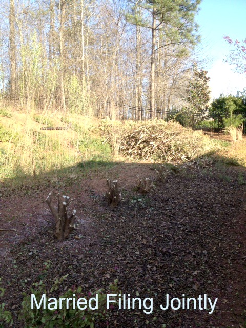 Since November we have ben anxiously awaiting spring so we can start project get a backyard (must be said in a CSI voice). So, April 1st means it’s offically that time. After lots of research from my husband and several drawn backyard landscape plans (thank goodness I married an engineer) it was time to begin tearing out the bushes. First step? Cut down the bushes and drag to the curb for the city to pick up on trash pick up day. The hubs cut the bushes down….looks different around, huh?