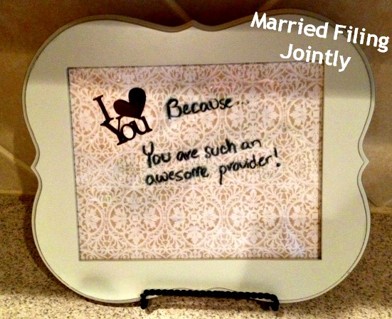 To make this project I used a pretty wood frame I found at Hobby Lobby and put a sheet of scrapbook paper inside. I used my cricut machine to cut out the “I heart you” letters on a vinyl sheet and stuck the cutout to the piece of scrapbook paper. I then put the scrapbook paper inside the frame, bought a cookbook stand, some markers, and TA-DA! Project complete!