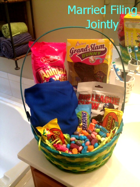 If you can’t tell how much of a kid I am at heart after this post you’re crazy…lol! But my husband and I started making Easter baskets for each other when we were dating in high school and the tradition stuck. Here’s our baskets to each other this year: