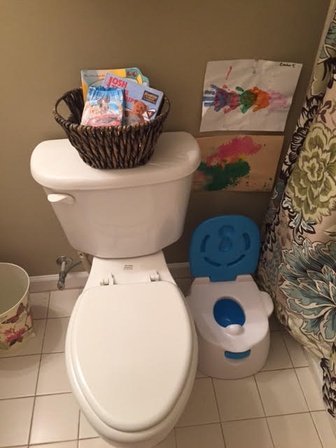 2. I created an organized, fun potty spot for my toddler. It was easy and cost effective. Really all I purchased (in addition to the Pull-Ups Cool & Learn) was this neat potty I found at Walmart. My little guy helped pick it out in his favorite color (blue). We put it right next to the big potty to help him understand the concept. I hung a few pieces of his favorite art work above the potty which he LOVED. I also put a basket nearby that houses an extra Pull-Up and a few of his favorite books. Thanks to the Pull-Up he will go in to his special “potty spot” take off his own Pull-Up, sit down, and look at his books. We make a really big deal of it and are sure to tell him what a big boy he is.