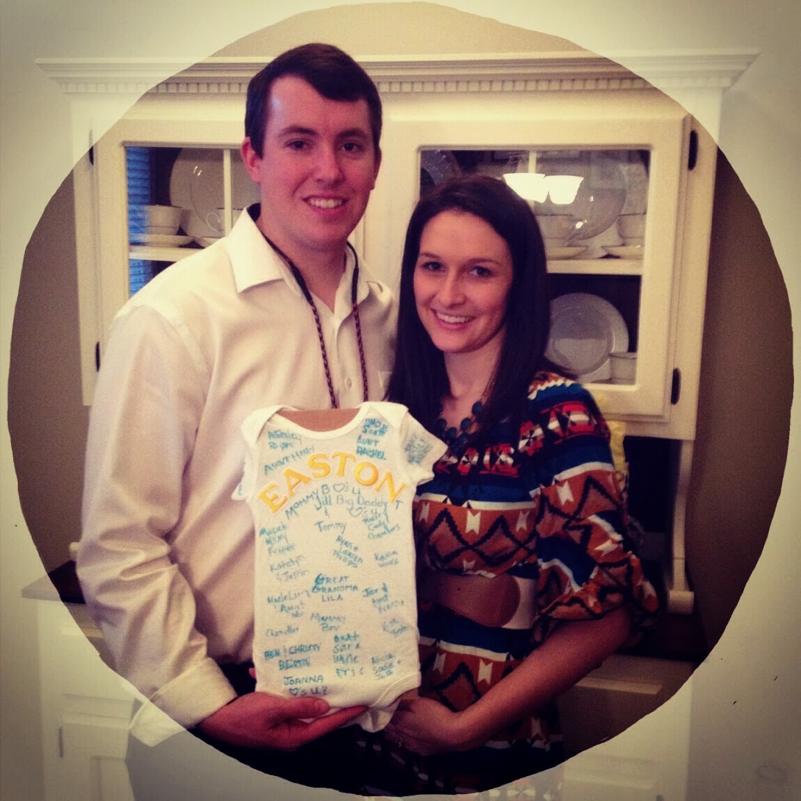 Once we made the announcement on gender we got to announce the name. I then had every guest sign his onsie I made with his name on it in the colors I am doing his nursery. That way I can tell him all the people who love him most and prayed for him before he was even born have their name in his room. 🙂